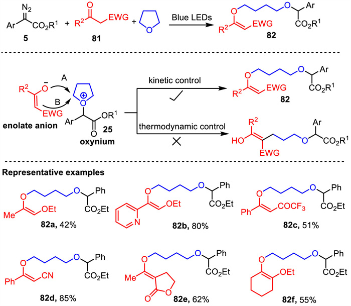 The control of regioselective C/O-alkylation of 1,3-dicarbonyl compounds has been long-term research interest in synthetic chemistry. In 2023, Li’s group reported a novel visible-light-promoted three-component alkylation reaction of 1,3-dicarbonyl compounds, aryldiazoacetates and cyclic ethers [84]. This reaction could undergo through selective O-alkylation of 1,3-dicarbonyl compounds beyond C-alkylation, which provides an environmentally benign and practical approach to construct highly stereoselective enol ethers. The representative examples are demonstrated in Scheme 28. Many 1,3-dicarbonyl compounds such as ethyl 3-oxobutanoate, 3-oxo-3-(pyridin-2-yl)propanoate, and substrates including other electron-withdrawing groups (COCF3 and CN) all worked well and delivered products 82a-82d in 42%–85% yields. It is worth noting that five- and six-membered 1,3-dicarbonyl compounds were also suitable in this transformation, providing the corresponding products 82e and 82f in 62% and 55% yields.