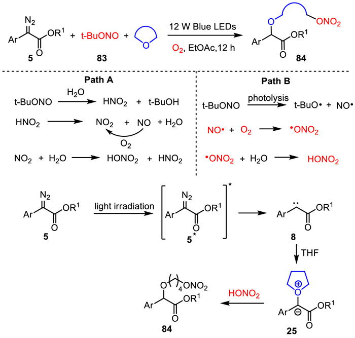 The possible reaction mechanism for this transformation is proposed as shown in Scheme 29. First, t-BuONO underwent the hydrolysis with water to afford nitrous acid. The decomposition of nitrous acid generated NO and NO2. Then, NO could be rapidly oxidized by dioxygen to form NO2, which reacted with H2O to access HNO3 (path A). Another pathway B for the synthesis of HNO3 was that t-BuONO generated NO under visible-light-irradiation. The subsequent oxidation of NO by O2 afforded ·ONO2, which reacted with H2O to give HNO3. Meanwhile, α-diazoesters 5 generated the excited state 5* under visible-light irradiation, which decomposed to generate carbene intermediate 8. This carbene intermediate 8 was trapped by THF to form oxonium ylide intermediate 25. Finally, intermediate 25 underwent nucleophilic reaction with HNO3 to construct the desired product 84.