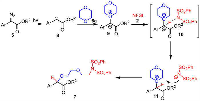 The possible mechanism is demonstrated as shown in Scheme 3. First, aryl diazoacetate 5 was irradiated by visible light to generate the carbene intermediate 8, which was trapped by 1,4-dioxane to gain the oxonium ylide intermediate 9. Then, NFSI 2 underwent fluorination reaction with the oxonium ylide intermediate to yield 11. Finally, the nucleophilic addition of benzenesulfonimide negative ion to oxonium ylide intermediategave the desired product 7.
