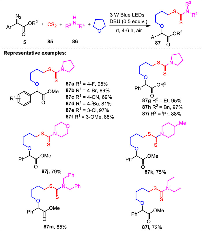 In 2022, He's group reported a facile visible-light-induced strategy for the synthesis of N,S-dialkyl dithiocarbamates through multi-component reaction of α-diazoesters, amines, CS2 and tetrahydrofuran [97]. This transformation could rapidly and efficiently obtain various structurally diverse four-component coupling products with the assembly of the ring-opening of THF by simply using DBU as the additive (Scheme 30). The reaction exhibited a broad substrate scope at room temperature. α-Diazoesters with diverse substituents, including electron-deficient or electron-rich groups at varying positions on the phenyl moiety, reacted rapidly to afford the diverse N,S-dialkyl dithiocarbamates 87a-87f in excellent yields. α-Diazoesters with different ester groups such as ethyl, benzyl and isopropyl groups were all suitable substrates, generating the corresponding products 87g-87i in good yields. The scope of amines was also investigated. Apart from pyrrolidine, cyclic amines such as morpholine and 4-methylpiperidine were compatible with the reaction, delivering the desired products 87j and 87k in 79% and 75% yields. In addition, acyclic secondary amines such as dimethylamine and dibenzylamine also participated reaction effectively, affording the corresponding products 87l and 87m in 72% and 85% yields.