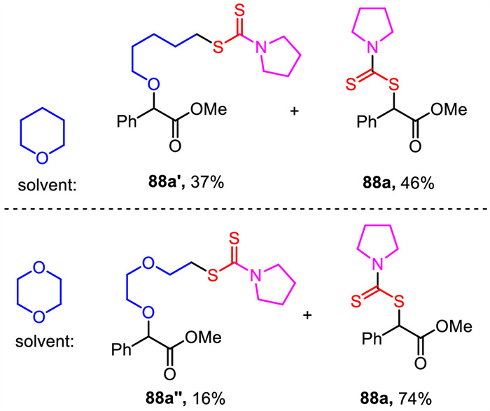Other cyclic ethers such as tetrahydropyran and 1,4-dioxane were also examined in this reaction system. As shown in Scheme 31, when tetrahydropyran was used as the solvent, the reaction afforded the mixture of three-component dithiocarbamate 88a and four-component product 88a’ with the ring-opening of tetrahydropyran. When 1,4-dioxane was employed as the solvent, three-component dithiocarbamate 88a was obtained as main product and four-component product dithiocarbamate 88a’’ was isolated with a low yield.