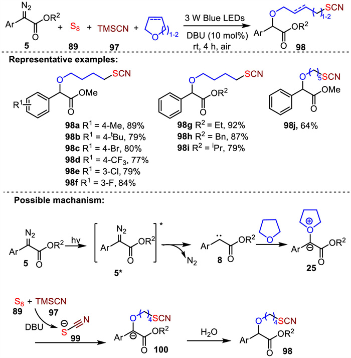 In the same year, Wei’s group developed a visible-light-induced DBU (10 mol%) catalyzed four-component reaction of α-diazoesters, elemental sulfur, cyclic ethers and TMSCN [99]. This reaction exhibited a broad substrate scope, which avoided the use of metal catalysts, strong oxidants and harsh reaction conditions. α-Diazoesters bearing either electron-donating or electron-withdrawing substituents at various positions of the aromatic ring all reacted effectively under the standard conditions, affording the desired products 98a-98f in 77%−89% yields. Next, the effect of ester substituents in aryldiazoacetates was investigated. Besides methyl group, other groups including ethyl, benzyl and isopropyl groups were all compatible with the reaction system, yielding the corresponding products 98g-98i in 79%−92% yields. Other cyclic ether such as tetrahydropyran was also well tolerated to form the corresponding product 98j in 64% yield. The proposed mechanism involved the reaction of elemental sulfur with TMSCN to generate thiocyanate anion 99 and its subsequent nucleophilic attack on oxonium ylide intermediate 25 to give organic thiocyanate 98 (Scheme 33).
