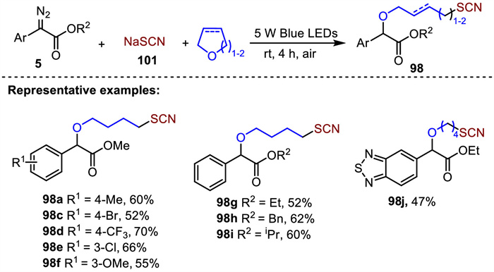 Shortly afterward, Wei and Zhong also proposed a green and environmentally three-component visible-light-promoted reaction of α-diazoesters, cyclic ethers and NaSCN to access the organic thiocyanate [100]. In this system, α-diazoesters bearing various substituents on both the aromatic ring and ester group reacted smoothly under the standard conditions, affording the desired products in 52%−70% yields. Notably, heteroaryl α-diazoester was also suitable substrate to yield the corresponding product 98j in 47% yield (Scheme 34).