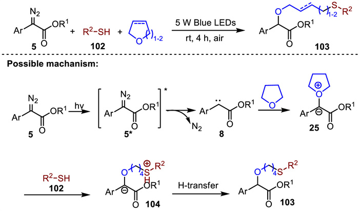 Thioethers frequently exist in various pharmaceutical and bioactive molecules. In 2023, Wei’s group reported an additive-free visible-light-induced three-component carbene transfer reactions of α-diazoesters, cyclic ethers and thiols to access thioethers [101]. This multi-component reaction could be conducted under mild conditions to access various thioethers in moderate to good yields. The proposed mechanism is presented in Scheme 35, visible-light irradiation of α-diazoester 5 generated the excited state 5*, which underwent denitrification to form carbene intermediate 8. Subsequently, carbene 8 was captured by THF to form oxonium ylide intermediate 25. Nucleophilic attack of thiols 102 on oxonium ylide 25 gave the carbanion intermediate 104. Finally, the carbanion intermediate 104 underwent intramolecular hydrogen transfer to produce the desired product 103 (Scheme 35).