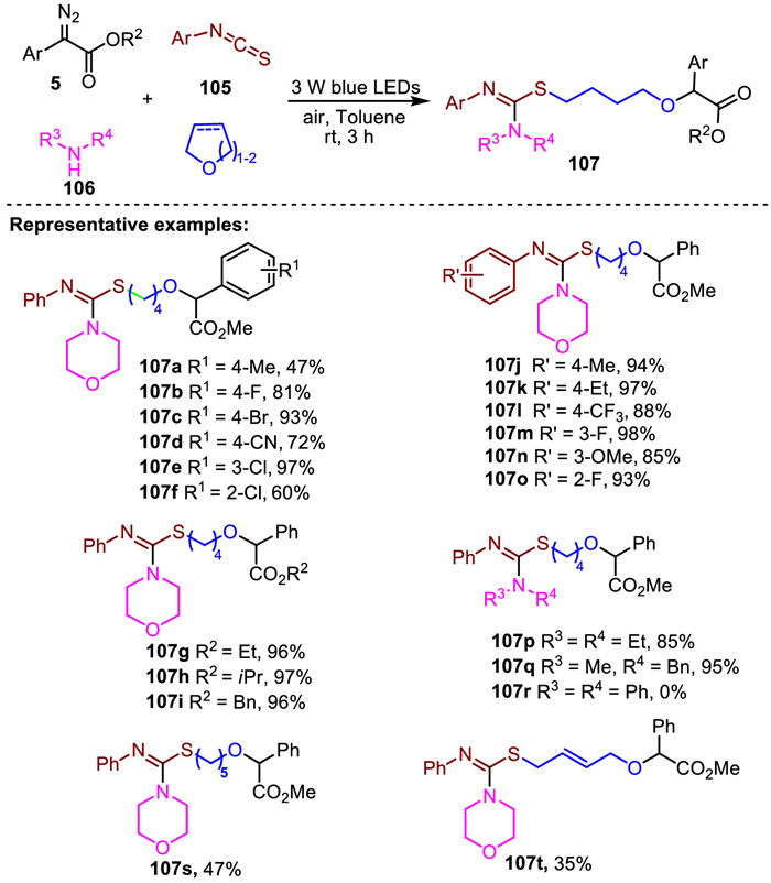 In 2024, Yi and Wei developed a green and additive-free photochemical four-component reaction of α-diazoesters, aryl isothiocyanates, amines and cyclic ethers to synthesize S-substituted isothioureas (Scheme 36) [102]. This strategy has the advantage of mild reaction conditions, simple operation, high efficiency, and good functional group tolerance, which demonstrates its potential for application in organic synthesis and medicinal chemistry. Representative examples are presented in Scheme 35, α-diazoesters bearing various substituents on both the aromatic ring and the ester group reacted efficiently under the standard conditions, providing the corresponding products 107a-107i in 47%−97% yields. Aryl isothiocyanates with various groups at different positions of the aryl rings also showed good reactivity, affording the desired four-component products 107j-107o in good yields. Furthermore, secondary aliphatic amines such as diethylamine and N-methyl-1-phenylmethanamine were compatible with this procedure, generating the corresponding products 107p and 107q in 85% and 95% yields. However, when a secondary aromatic amine such as diphenylamine was used in this reaction system, no transformation was observed. In addition, other cyclic ethers including tetrahydropyran and 2,5-dihydrofuran also participated effectively to afford the desired products 107s and 107t in moderate yields.