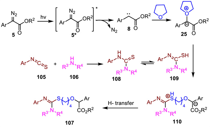The corresponding reaction mechanism is demonstrated in Scheme 37. First, carbene intermediate 8 was formed from the excited state 5* under visible-light irradiation. Then, carbene intermediate 8 reacted with THF to give oxonium ylide 25. On the other hand, the addition of amine 106 to aryl isothiocyanate 105 gave thiourea 108. Next, the tautomerization of thiourea 108 afforded isothiourea 109, which underwent the nucleophilic addition to oxonium ylide intermediate 25 and further ring-opening reaction afforded intermediate 110. Finally, the four-component product 107 was produced through the intramolecular H-transfer process.