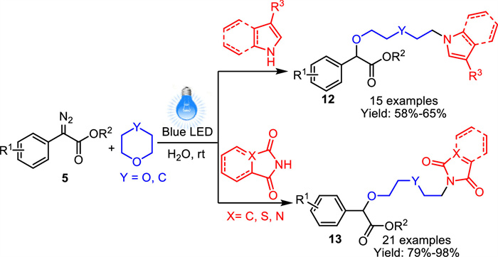In 2021, Sen’s group established an additive-free visible-light-promoted three-component amino etherification reaction of aryl diazoacetates, 1,4-dioxane/tetrahydropyran (THP) and N-nucleophiles such as pyrroles and indoles in water (Scheme 4) [61]. A number of aryl diazoacetates and N-heterocycles were tolerated in this reaction system, in which oxonium ylides could be formed in aqueous medium without use of any metal or base.