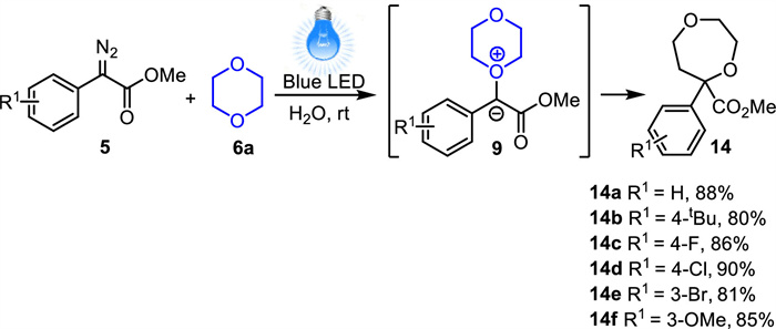 It’s worthy that the reaction of aryl diazoacetate with 1,4-dioxane readily undergoes 1,4-dioxane ring expansion process in the absence of external nucleophiles under irradiation of 3 W blue LEDs. Through this methodology, a series of seven-membered ring expanded aryl 1,4-dioxepane carboxylates 14 were obtained in good yields in water (Scheme 5).