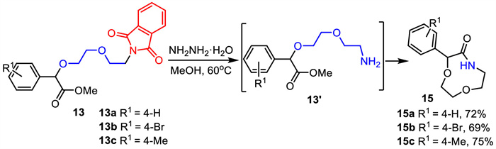 The transformations of phthalimide derivatives have also been carried out to show the utility of this visible-light-induced amino etherification reaction. Phthalimide derivatives reacted with NH2NH2·H2O at 60 ℃ in MeOH to easily construct the amine intermediate 13’, which underwent intramolecular lactamization with the ester moiety to access the dioxyazanonane 15 (Scheme 6). The formed amino crown ethers have potential application as clinical candidate against Hepatitis B infection, protein kinase inhibitors and cation complexing agents.