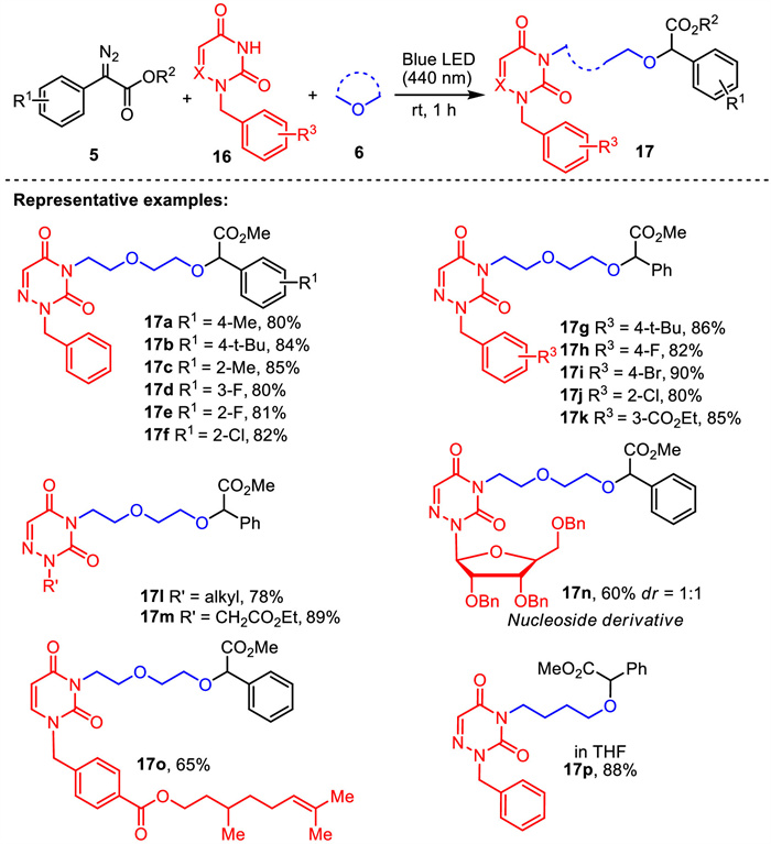 In 2023, Murarka's group described a visible-light-induced three-component imide alkylation of aryl diazoesters, azauracils andcyclic ethers leading to substituted imide products [62]. This alkylation reaction proceeded under mild conditions without requiring any catalyst or additives. Aryl diazoesters with electron-rich or electron-deficient substituents at the para-, meta- or ortho-positions of the phenyl ring provided the desired products 17a-17f in 80%−85% yields. Additionally, various azauracils bearing electronically and structurally varied N2-substituents afforded the corresponding products 17g-17m in 80%−90% yields. Pleasingly, azauridine and uracils were also suitable for this method, providing the desired products 17n and 17o in 60% and 65% yields, respectively. It should be noted that other cyclic ether such as tetrahydrofuran was tolerated in this procedure to afford the desired product 17p in 88% yield (Scheme 7).