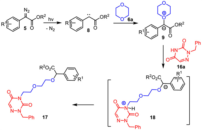 The possible mechanism for this three-component reaction is shown in Scheme 8. First, under the irradiation of blue light, α-diazoester generated carbene intermediate 8, which was trapped by 1,4-dioxane to gain oxonium ylide intermediate 9. Next, the subsequent nucleophilic addition of azauracil to oxonium ylide intermediate 9 afforded carbon anion intermediate 18. Finally, the intramolecular hydrogen transfer of 18 produced three-component product 17.