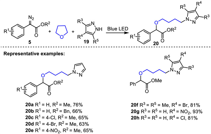 In 2022, Jurberg reported a simple visible-light-induced amino etherification reaction of aryl diazoesters with cyclic ethers and pyrazoles leading to substituted pyrazoles [63]. As demonstrated in Scheme 9, a number of different aryl diazoesters and pyrazole rings containing donor or electron-withdrawing groups allowed the synthesis of compounds 20 in 63%−93% yields.