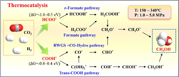 Figure 1.  Pathways of thermal catalytic CO2-to-methanol conversion with SACs.