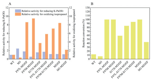 Figure 2  (A) Relative activity of the cell-free extracts of the wild-type (WT) SSCR and its variants. The activity of the WT was defined as 1.0. (B) WT- or its variant-catalyzed reduction of K-PaOEt to (R)-PaOEt. Reaction conditions (1 mL): K-PaOEt (50 mmol/L), NADP+ (1 mmol/L), isopropanol (10%, v/v), and 40 g/L cell-free extracts (CFE) (wet cell weight) of KREDs in NaPi buffer (100 mmol/L, pH 7.0). Reaction mixtures in the Eppendorf tubes were shaken in a temperature-controlled orbital shaker at 30 ℃ and 200 rpm for 3 h.