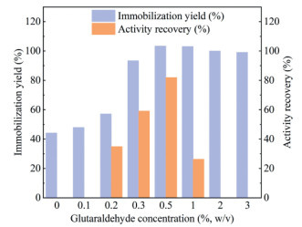 Figure 3.  The immobilization yield and activity recovery of M2@amino resin prepared under different concentrations of glutaraldehyde (0–3%, w/v).