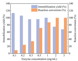 Figure 4  The immobilization yield and reaction conversion achieved with M2@amino resin prepared using different concentrations of free enzyme (0.1–3 mg/mL).