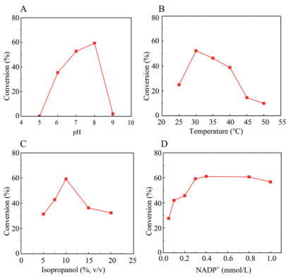 Figure 5.  Optimization of reaction conditions on pH (A), temperature (B), concentration of isopropanol (C), and NADP+ dosage (D).
