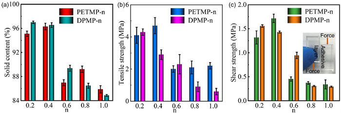 Figure 1  (a) Solid content and (b) the tensile strength of UV-cured films with different formulations. (c) Shear strength of photosensitive adhesives with different formulations.