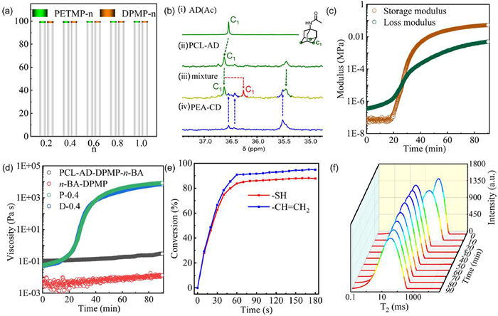 Figure 2  (a) Volume shrinkage of photosensitive adhesives with different formulations. (b) Partial 13C NMR spectra of (ⅰ) 1-acetamidodamantane, (ⅱ) PCL-AD, (ⅲ) the mixture of PCL-AD and PEA-CD, and (ⅳ) PEA-CD in DMSO–d6, Storage and loss modulus of (c) the mixture of PCL-AD, PEA-CD and 0.5 g n-BA, and (d) viscosity of various mixture. (e) The conversion rate of thiol and ene in P-0.4 with irradiation time. (f) The curve of relaxation time T2 of P-0.4 with gelation process.