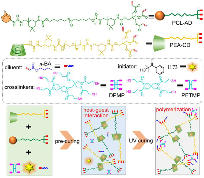 Here, we develop a supramolecular interaction mediated UV curing adhesive, enabling low volume shrinkage after curing. The main components of this adhesive are two prepolymers, polyurethane adamantane (PCL-AD) and polyurea-cyclodextrin (PEA-CD), which are stored separately until use (Scheme 1). The ends of both prepolymers contain triacrylate groups, while other ends of PCL-AD and PEA-CD are adamantane (AD) and cyclodextrin (CD), respectively. The curing process includes two steps: Supramolecular pre-curing and UV-driven curing. In the pre-curing step, the host-guest interaction between CD and AD promotes the thorough mixing of the two prepolymers to form a supramolecular assembly and to increase the viscosity significantly, thus preventing adhesive loss and making preliminary positioning. Subsequently, the triacrylate at both ends of the supramolecular assembly and the additive thiol would undergo thiol-ene "click" polymerization under UV irradiation to complete curing. The supramolecular pre-organization during pre-curing presets the internal network of the adhesive, reducing the space for further shrinkage. Moreover, different from other UV curing adhesives, the thiol-ene “click” reaction is a stepwise polymerization process that reduces the shrinkage stress. Therefore, the volume shrinkage rate of the adhesive is < 2% after curing. More importantly, the photosensitive adhesive endows excellent UV lithography performance, which can realize high-volume lithography.