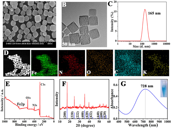 Figure 1.  Characterization of the obtained PBNCs. (A) SEM image, (B) TEM image, (C) DLS measurements, (D) elemental mapping, (E) XPS survey spectra, (F) XRD spectra, (G) UV–vis absorption spectra and the photo of the solution (inset).