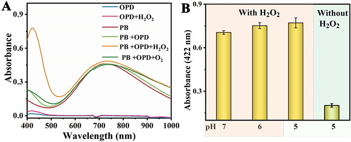 Figure 2  (A) UV–vis spectra of PB nanozymes-OPD system solution under different conditions. (B) The oxidation of OPD by PB nanozyme at different pH and with or without H2O2. Data are presented as mean ± standard deviation (SD) (n = 3).