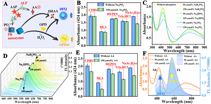 Figure 3  (A) Schematic illustration of the ratio fluorescence system for ALP detection. (B) Oxidation of OPD in the presence and absence of phosphate in different buffers. (C) UV absorption spectra and (D) fluorescence spectra of the proposed system in the presence and absence of different types of phosphates. (E) Oxidation of OPD in the presence and absence of AA in different buffers. (F) UV absorption spectra and fluorescence spectra of the proposed system in the presence and absence of AA. Data are presented as mean ± SD (n = 3).
