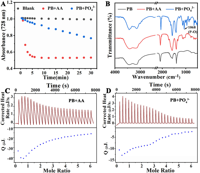 Figure 4.  (A) Scatter plot of absorbance values at 728 nm versus time for PB reacted with 150 µmol/L of AA and phosphate. (B) FT-IR of PB after reaction with AA and phosphate in buffer solution. ITC traces of titrating (C) AA and (D) phosphate into PB nanozymes.