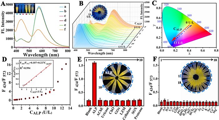 Figure 5  (A) ALP detection feasibility analyses corresponding to fluorescence spectra (a: PB+OPD+H2O2, b: ALP +OPD+H2O2, c: AAP+OPD+H2O2, d: ALP+PB+OPD+H2O2, e: AAP+PB+OPD+H2O2, f: AAP+ALP+PB+OPD+H2O2). (B) 3D fluorescence spectra of ALP at concentrations of 0–13 U/L were present. (C) CIE chromatograms with 0–13 U/L ALP. (D) Correlation between F434/F573 and ALP concentration. Inset: linear correlation between F434/F573 and ALP concentration (0.25–6 U/L). (E) Fluorescence intensity ratios in the presence of ALP and different kinds of natural enzymes and (F) different kinds of reducing substances, anions and cations.