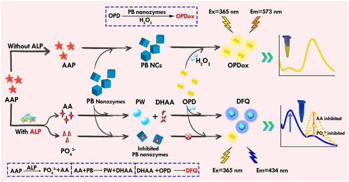 In conclusion, a simple and effective ratiometric fluorescence approach utilizing PB nanozymes and commercially available chromogen has been developed for the highly sensitive and selective detection of ALP. The hydrolysis products AA and phosphate could effectively decrease the OPDox generation via a dual-path based inhibition on the PB nanozymes POD-like activity, thereby supporting sensitive ALP detection. Additionally, the specific interaction between DHAA (the oxidation product of AA and OPD enhances the potential for selective ALP detection. This strategy offers advantages of sensitivity, selectivity, simplicity, and practicality, serving as a significant reference for the advancement of more efficient ratiometric fluorescence analyses based on nanozymes. It is worth noting that the role of PB nanozymes in our design is diversified, such as the direct use of PB nanozymes and the color of the chromogen OPD to construct multi-colorimetric sensing, and simply employing of smart phones to achieve sensitive point-of-care testing in the future.