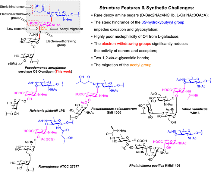 The O3 O-antigen structure of P. aeruginosa has been shown to consist of a rare tetrasaccharide repeating unit characterized as follows: [→2)-α-L-Rha-(1→6)-α-D-GlcNAc-(1→4)-α-L-GalNAc3OAcA-(1→3)-β-D-Bac2NAc4NSHb-(1→] (Fig. 1) [26]. Approximately 40% of these repeating tetrasaccharides feature an acetyl group at the 3-O position of L-rhamnose (L-Rha). Noteworthily, nonstoichiometric O-acetylation is frequently observed within the LPS of P. aeruginosa [26]. This tetrasaccharide, which contains three rare amino sugars, possesses various functional groups at specific positions [27,28]. A 3S-hydroxybutyryl (Hb) amide linker is attached to the C4 position of the D-bacillosamine (D-Bac) unit, while both the L-galactose (L-Gal) and D-glucose (D-Glc) units carry an acetylamino group at the C2 position. The unique composition of rare sugars, combined with an unusual side chain, is seldom found in host cellular structures, rendering this tetrasaccharide O-antigen a promising candidate for vaccine development [29,30]. The identification of the D-Bac unit has revealed correlations with pathogenicity in specific contexts, establishing this tetrasaccharide as a compelling focus for pathogenicity studies [31]. Although the α-L-GalNAcA-(1→3)-β-D-Bac disaccharide motif and its derivatives are prevalent in many bacterial polysaccharides [22,3235], there have been no reports of the selective oxidation of the primary alcohol on the L-Gal unit to galacturonic acid in the presence of the 3S-Hb group on the D-Bac unit (Fig. 1). Current research on the use of the L-Gal unit as an acceptor in disaccharide assembly is notably limited, especially when the linkage site is at the C4 hydroxyl group and both acetyl and carboxyl electron-withdrawing groups are simultaneously present. Recently, the Gao group reported the synthesis of the LPS O-antigen of P. aeruginosa ATCC 2757 using an artificially tuned sequence, positioning the L-Gal unit at the non-reducing end to avoid the construction of the (1→4)-L-Gal glycosidic bond [22]. Our team also reported the synthesis of the LPS O-antigens of P. aeruginosa serotypes O10 and O19, where the (1→4)-L-Gal glycosidic linkage was constructed; however, their synthetic sequences lacked an acetyl group on the L-Gal unit [23], thereby increasing the synthetic challenge of this work. To date, the chemical synthesis of the O3 O-antigen tetrasaccharide repeating unit of P. aeruginosa has not been reported, presenting significant synthetic challenges. First, the monosaccharides corresponding to this LPS, including D-GlcNAc, L-GalNAc3OAcA, and D-Bac2NAc4NSHb, are rare sugars that are not commercially available. Second, when an acetyl group is located in the ortho position relative to the glycosylation site of L-galactose, it may induce undesirable acetyl migration. Third, glycosylation at the C4 hydroxyl group of the L-Gal unit is particularly challenging due to its low reactivity in the presence of electron-withdrawing groups at adjacent positions. Fourth, the target structure contains various functional groups, including acetyl, carboxyl, acetamido, and a 3S-hydroxybutyryl (Hb) chain, with the 3S-Hb group contributing significant steric hindrance. Therefore, adopting a well-considered orthogonal protection strategy and a carefully designed reaction sequence is essential to ensure the feasibility and efficiency of the synthesis. Herein, we report the first chemical synthesis of the P. aeruginosa serotype O3 O-antigen tetrasaccharide. A linker featuring a free amino group was incorporated at the reducing end of the tetrasaccharide, allowing for subsequent modifications or conjugation with other molecules [36,37]. This advancement will significantly enhance biological and immunological investigations of this O-antigen.