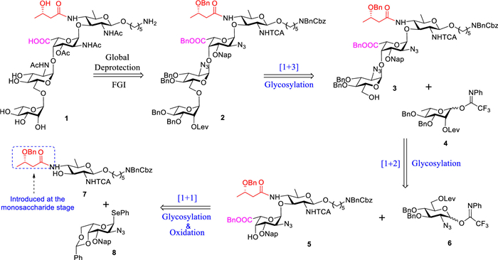 Figure 2  Retrosynthetic analysis of the P. aeruginosa serotype O3 O-antigen tetrasaccharide 1.