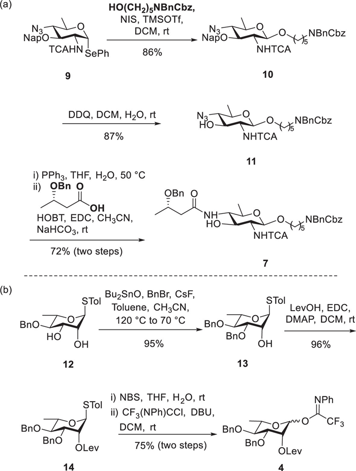 We initiated the synthesis by preparing orthogonally protected rare sugar building blocks (Scheme 1). The synthesis of building blocks 6 and 8 was conducted using modified procedures based on established literature methods [40,41]. The synthesis of acceptor 7 commenced from known D-Bac derivatives [42]. As depicted in Scheme 1a, glycosylation of donor 9 with a protected amino-pentanol linker (N-Bn-N-Cbz-5-aminopentane-1-ol), promoted by trimethylsilyl trifluoromethanesulfonate (TMSOTf) and N-iodosuccinimide (NIS) as activators, afforded product 10 in 86% yield with exclusive β-stereoselectivity (anomeric proton of the donor residue: 4.85 ppm, 3JH1/H2 = 8.4 Hz). The Nap protecting group was removed through 2,3-dichloro-5,6-dicyano-1,4-benzoquinone (DDQ)-mediated oxidative cleavage. Subsequently, the azide functionality underwent Staudinger reduction to produce the corresponding amine, which was then coupled with 3S-hydroxybutyric acid under 1-ethyl-3-(3-dimethylaminopropyl)carbodiimide (EDC), hydroxybenzotriazole (HOBT), and sodium bicarbonate (NaHCO3) conditions, resulting in the C4-amide acceptor 7 with an overall yield of 72% across both steps. The synthesis of building block 4 from the known L-rhamnose diol 12 is shown in Scheme 1b [43]. A tin-mediated regioselective protection of the C3 hydroxyl group with dibutyltin oxide (Bu2SnO) and benzyl bromide (BnBr) produced 13 in 95% yield. Treatment with levulinic acid (LevOH) and EDC efficiently converted 13 into the corresponding ester 14 in 96% yield. Following the levulinylation of the C2 hydroxyl group, the thioglycoside 16 was further transformed into the trifluoroacetimidate donor 4, achieving an overall yield of 75%.