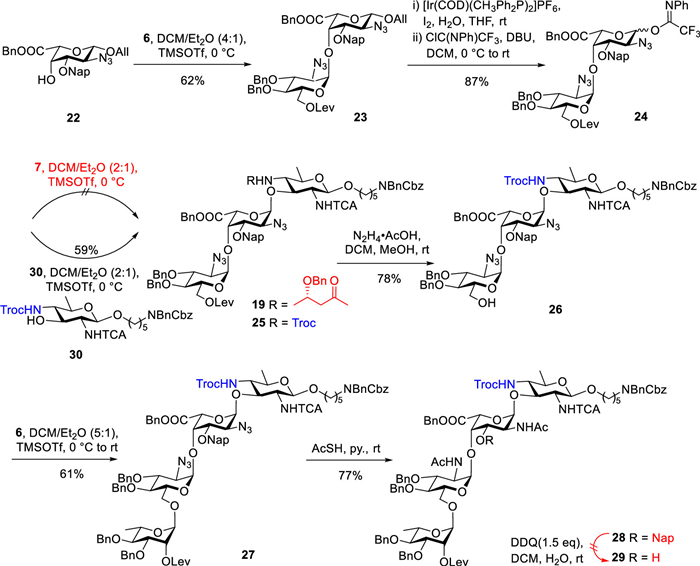 The union of acceptor 22 with trifluoroacetimidate donor 6, in the presence of TMSOTf at 0 ℃, afforded disaccharide 23 with a yield of 62% and complete α-selectivity (anomeric proton of the donor residue: 5.50 ppm, 3JH1/H2 = 3.6 Hz) (Scheme 4) [41]. The removal of the allyl group was accomplished by using [Ir(COD)(CH3Ph2P)2]PF6, resulting in the complete conversion of 23 into the corresponding vinyl ether. Following this, hydrolysis with iodine (I2) and water in tetrahydrofuran (THF) yielded the desired alcohol quantitatively. The introduction of the trifluoroacetimidate then furnished donor 24 with an overall yield of 87%. Unfortunately, the glycosylation of disaccharide donor 24 with acceptor 7 was unsuccessful. Analysis revealed the presence of decomposed donor byproducts and unreacted acceptor, suggesting that the steric hindrance from the 3S-Hb group in 7 may impede the glycosylation reaction. Furthermore, we hypothesize that disaccharides inherently exhibit greater steric hindrance than monosaccharides when acting as donors, which further limits the nucleophilic attack of the acceptor. To address these challenges, disaccharide 24 was utilized to glycosylate acceptor 30 (see Supporting information) in the presence of TMSOTf, a condition that proved effective for trisaccharide formation. We successfully obtained trisaccharide 25 (α:β = 8:1, α: anomeric proton of the donor residue: 5.13 ppm, 3JH1/H2 = 3.4 Hz) in 59% yield. Subsequent cleavage of the levulinoyl ester using hydrazine acetate yielded trisaccharide acceptor 26, which was further glycosylated with building block 6 to produce tetrasaccharide 27 (anomeric proton of the donor residue: 4.66 ppm, 1JC1/H1 = 171.4 Hz) in 61% yield. The conversion of the azide to the corresponding acetamido was accomplished by using thioacetic acid (AcSH) in pyridine, resulting in the acetamido-sugar 28 in 77% yield. However, oxidative cleavage of the Nap ether with DDQ resulted in a low yield (Table S2 in Supporting information, entry 1). Increasing the equivalents of DDQ or extending the reaction time led to significant degradation of the starting materials (Table S2, entries 2 and 3) [52]. We attempted to substitute 1,2-dichloroethane (DCE) for dichloromethane or to add the additive β-pinene to facilitate the removal of Nap ether (Table S2, entries 4 and 5) [53,54]; however, only trace amounts of products were detectable by matrix-assisted laser desorption/ionization time-of-flight mass spectrometry (MALDI-TOF). Ceric ammonium nitrate (CAN) and HF·pyridine were also evaluated as alternative methods, but did not yield the expected amount of the product (Table S2, entries 6 and 7) [55,56]. Lowary and co-workers reported that selectively cleaving Nap ethers in the presence of abundant benzyl ethers (seven in this case) is particularly challenging due to competitive debenzylation [52].