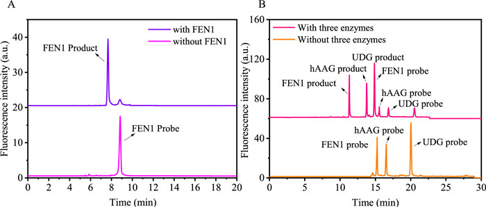 CE-LIF detection platform was also constructed to analyze the different length DNA amplification products. As shown in Fig. 1, only the FEN1 probe peak appeared in the absence of FEN1 (Fig. 1A, light purple curve). However, a new peak appeared in the presence of FEN1 accompanied by the decrease of the peak area of FEN1 probe, demonstrating that FEN1 induced amplification reaction to generate the new DNA strand with fluorophore (Fig. 1A, bluish violet curve). Similarly, only the hAAG probe peak appeared in the absence of hAAG (Fig. S2A in Supporting information, orange curve), as well as a new peak appeared in the presence of hAAG accompanied by the exhaustion of the hAAG probe (Fig. S2A, purple curve). Moreover, only the UDG probe peak appeared in the absence of UDG (Fig. S2B in Supporting information, cyan curve) as well as a new peak appeared in the presence of UDG (Fig. S2B, green curve). We further investigated the simultaneous detection of the three enzymes in the homogeneous system, as shown in Fig. 1B, only three peaks of the probes are present in the absence of target enzymes (Fig. 1B, orange curve). However, three new product peaks appeared when three enzymes existed simultaneously (Fig. 1B, pink curve). These results demonstrated that target enzymes could initiate the amplification reaction to produce different length DNAs which could be separated by CE.