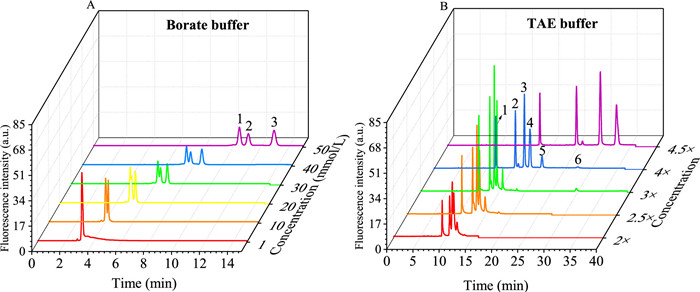 Figure 2.  Optimization of electrophoresis separation conditions. The electropherogram obtained under different buffer system: (A) Borate buffer system, pH 8.8; (1) FEN1 probe, (2) hAAG probe, (3) UDG probe. (B) TAE buffer system, pH 8.5; (1) FEN1 product, (2) hAAG product, (3) UDG product, (4) FEN1 probe, (5) hAAG probe, (6) UDG probe. Other CE separation conditions were the same as those in Fig. 1A.