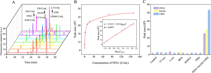 Figure 3  The sensitivity and selectivity for the strategy. (A) Electropherograms of FEN1, hAAG and UDG in a defined range. (B) The linear relationship between the peak area and concentration of FEN1. (C) The selectivity of the method. T7 Exo (250 U/mL), λ Exo (250 U/mL), BSA (5 mg/mL), hOGG1 (250 U/mL), TDG (250 U/mL), FEN1 (160 U/mL) + hAAG (250 U/mL) + UDG (2.5 U/mL).