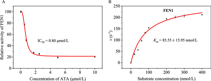 Figure 4.  Inhibition and enzyme kinetic analysis. (A) Relationship between the relative activity of FEN1 and the concentration of ATA. (B) Enzyme kinetic curve for FEN1 (80 U/mL) assay in the substrate concentration range of 0-400 nmol/L.