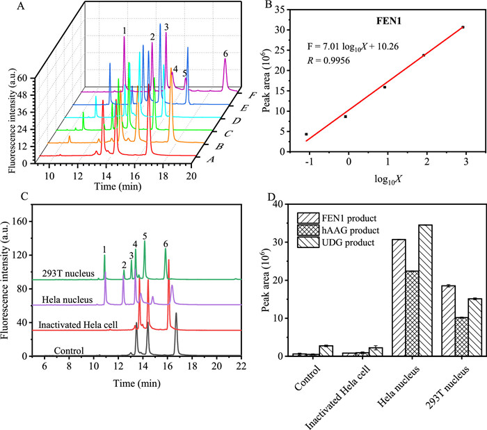 Figure 5  Practical application of the method. (A) Electropherograms of three enzymes in different concentration of Hela cell extract. Numbers 1-6 as labeled in Fig. 2B. The concentration of cell extract (µg/mL), A: 0.0082; B: 0.082; C: 0.82; D: 8.23; E: 82.26; F: 822.6. (B) The relationship between the peak area and logarithmic value of Hela nuclear extract concentration. (C) Electropherograms and (D) histogram for comparison of enzyme level in different cell extract, respectively. The total amount of both 293T cell and Hela cell extract is 2 × 106.