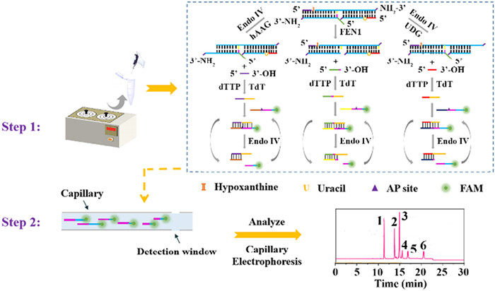 Scheme 1.  Schematic illustration of the CE-based fluorescence signal amplification strategy. (1) FEN1 product, (2) hAAG product, (3) UDG product, (4) FEN1 probe, (5) hAAG probe and (6) UDG probe.
