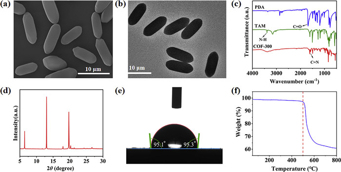 Figure 1  (a) SEM image, (b) TEM image, (c) FT-IR spectroscopy, (d) PXRD pattern, (e) water contact angle, and (f) TGA curve of single-crystal 3D COFs.