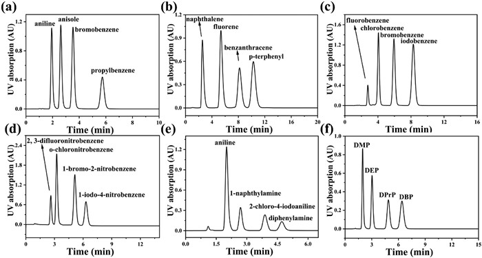 Figure 2.  Separation of (a) substituted benzenes, (b) PAHs, (c) halogeno benzenes, (d) halogenated nitrobenzenes, (e) aromatic amines, and (f) PAEs on the single-crystal 3D COFs packed column. Conditions: Mobile phase, ACN/H2O (100/00, v/v) in (b), ACN/H2O (70/30, v/v) in (c) and (e), ACN/H2O (80/20, v/v) in (d), ACN/H2O (85/15, v/v) in (a), and ACN/H2O (95/5, v/v) in (f); flow rate, 0.2 mL/min; detection wavelength, 210 nm for (b) and (c), 214 nm for (a), (d), (e) and (d).