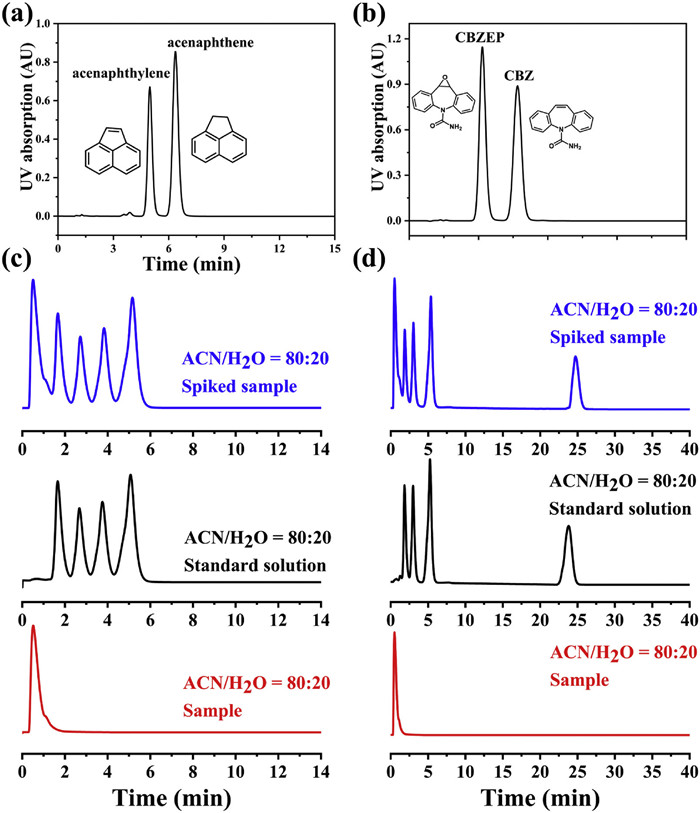 Figure 3.  Separation of (a) acenaphthene and acenaphthylene, (b) carbamazepine and carbamazepine 10, 11-epoxide, (c) polychlorobenzenes in waste-water, and (d) polybromobenzenes in waste-water on the single-crystal 3D COFs packed column. Conditions: mobile phase, ACN/H2O (80/20, v/v) in (a), (c), and (d), ACN/H2O (75/25, v/v) in (b); flow rate, 0.2 mL/min; detection wavelength, 210 nm for (a), and 214 nm for (b), (c) and (d).