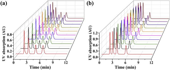 Figure 4.  The chromatograms for continuous 10 times separation of (a) substituted benzenes and (b) PAEs on the single-crystal 3D COFs packed column.