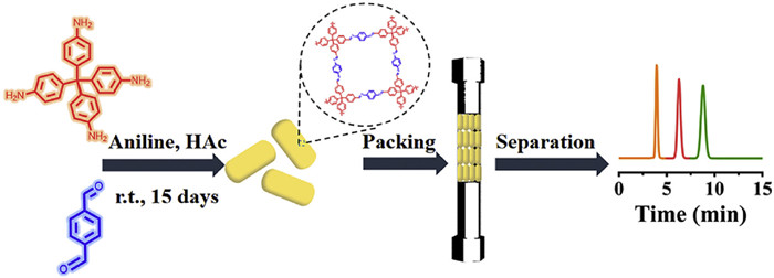 Covalent organic frameworks (COFs) are ordered two-dimensional (2D COFs) or three-dimensional (3D COFs) crystalline porous polymer materials constructed via dynamic covalent bonds of organic building elements [13, 14]. Due to its large surface area, ordered porosity, and high chemical and mechanical stability, COFs have shown great potential in the field of catalysis [15, 16], gas storage [17, 18], separation [19, 20], adsorption [21, 22] and sensing [23, 24]. These unique properties make it also particularly attractive in the field of chromatographic separation [25, 26].
