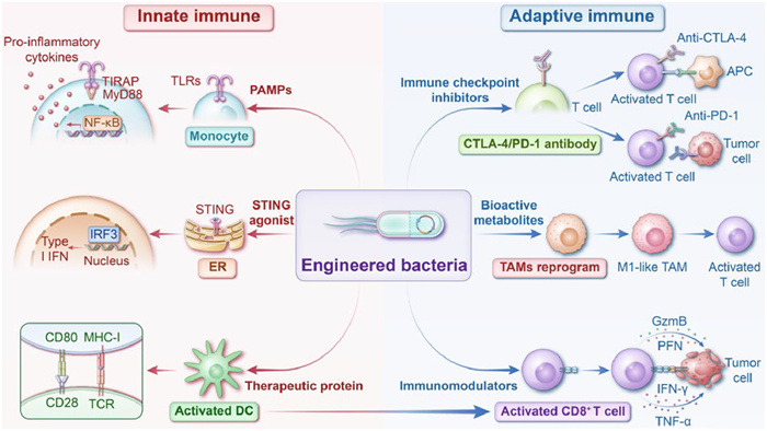 Table 1. Engineering bacteria with enhanced innate immunity. i.v., intravenous injection; i.t., intratumoral injection; p.o., oral administration.