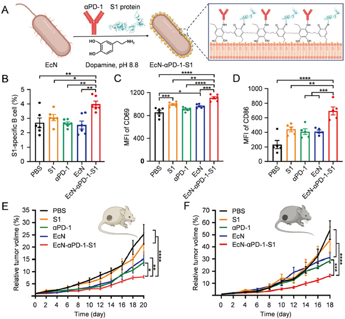 Figure 3 Engineering bacteria with a hybrid immunoreactive substance. (A) Decoration of EcN with a hybrid immunoreactive surface-bound αPD-1 and SARS-CoV-2 S1 proteins by one-step in situ polymerization of dopamine. (B) Percentage of SARS-CoV-2 S1-specific B cells analyzed by flow cytometry. (C) MFI on B cells activated with the CD69. (D) MFI on DCs co-stimulated with CD86. (E) Tumor suppression effect of CT26. (F) Tumor suppression effect of B16. All statistical data are represented as means ± standard error of mean (SEM; n = 6; P < 0.05, **P < 0.01, ***P < 0.001, ****P < 0.0001). Reproduced with permission [42]. Copyright 2023, Wiley Publishing Group.