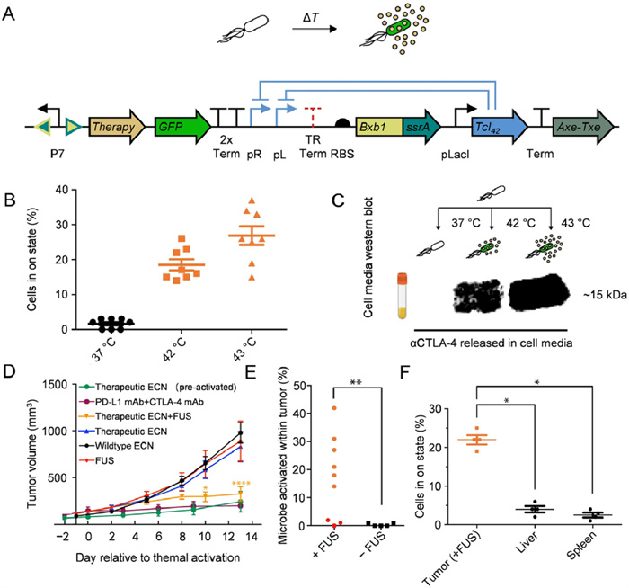Figure 4 Engineering bacterial heat activation for sustained release of immune checkpoint inhibitors. (A) Temperature responsive state switch modified to release αCTLA-4 or αPD-L1 nanobody. (B) Percent activation 24 h after 1-h thermal induction at 37, 42, or 43 ℃ for the circuit described in (A). (C) Western blot against hexahistidine-tagged αCTLA-4 nanobody. (D) Tumor suppression effect of A20. (E) Percent activation of therapeutic EcN isolated from FUS-treated and non-FUS-treated tumors two weeks after FUS treatment. (F) Background activation in bystander tissues following FUS activation of tumors. Percent activation of therapeutic EcN isolated from FUS-treated tumors and bystander organs (liver, spleen). All statistical data are represented as means ± SEM (n = 8 for B and C; n = 8 (therapeutic EcN, FUS), n = 10 (wildtype EcN), n = 4 (therapeutic EcN (pre-activated)); n = 6 (PD-L1 mAb+CTLA-4 mAb) and n = 7 (therapeutic EcN+FUS) for D; n = 9 (+FUS) and n = 5 (FUS) for E; n = 4 for F; P < 0.05, **P < 0. 01, ****P < 0.0001). Reproduced with permission [65]. Copyright 2022, Springer Nature.