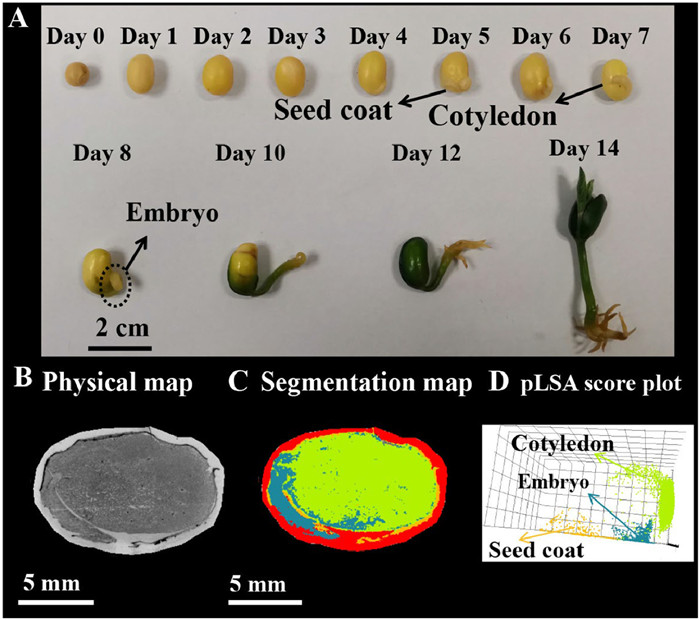 Figure 1.  (A) Optical images of soybean seeds at various timings during germination. The (B) physical map, (C) segmentation map, and (D) pLSA score plot.