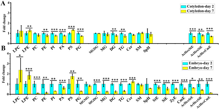 Figure 2  Fold changes of different lipid classes classified as GLs, sterols, GPs and SPs in the cotyledon (A) and embryo (B) in soybean seeds on germinating days 2 and 7. Data were expressed as the average ± standard deviation. Six replicates were included in each group. (*P < 0.05, **P < 0.01, ***P < 0.001).
